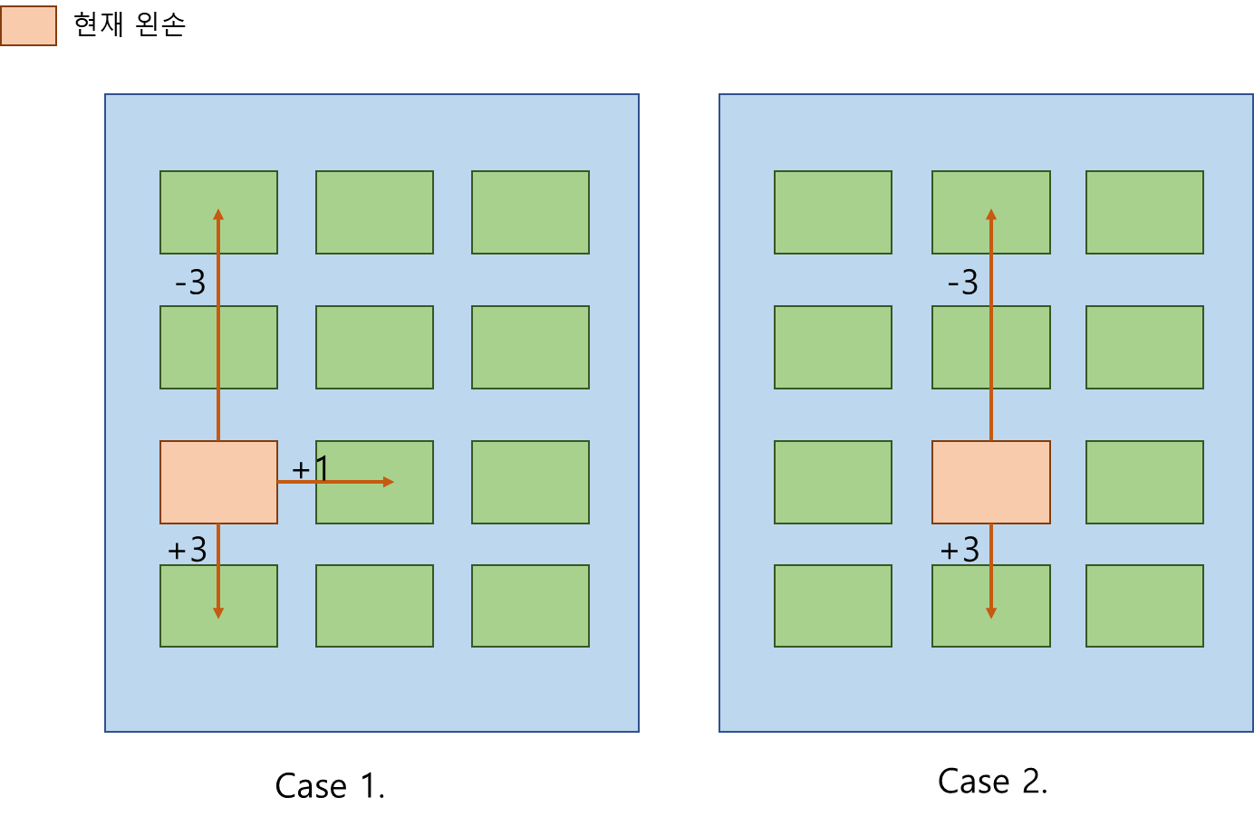 현재 왼손이 왼쪽 키패드 열 쪽에 있다면(case1), 중앙으로 한 칸을 옮겨준 뒤, 세로 차만큼 이동해주면 거리를 계산할 수 있다. case 2번의 경우 세로 이동만 하면 되므로, 바로 세로 차만큼 이동해준다면 거리를 계산할 수 있다. 오른쪽도 이와 마찬가지로 계산을 해주면 된다.
